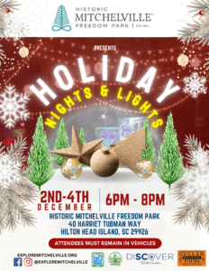 Join us for a mesmerizing drive through the Historic Mitchelville Freedom Park as it transforms into a winter wonderland! From December 2nd to 4th, our beloved Holiday Nights & Lights event returns, bringing with it twinkling lights and fun holiday displays.