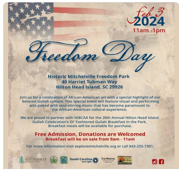 Hilton Head Island will celebrate National Freedom Day in Historic Mitchelville Freedom Park on Saturday, February 3rd, from 11 am- 1 pm. The annual celebration highlights the contributions of African Americans in the Lowcountry. This year’s celebration features the sensational Aunt Pearlie Sue and the Gullah Kinfolk. The award-winning theater group will both educate and entertain the audience about the direct ties between West Africa, especially Sierra Leone, with South Carolina and the entire Gullah-Geechee Corridor.